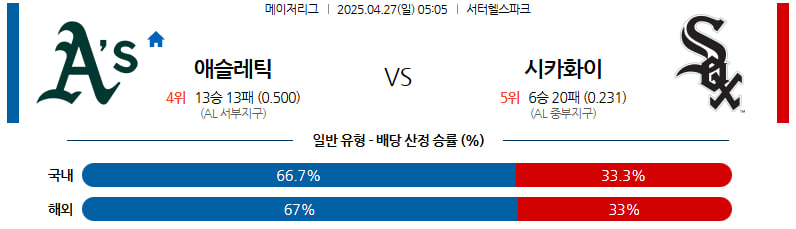 04월 27일 MLB 애슬레틱스 시카고W 분석