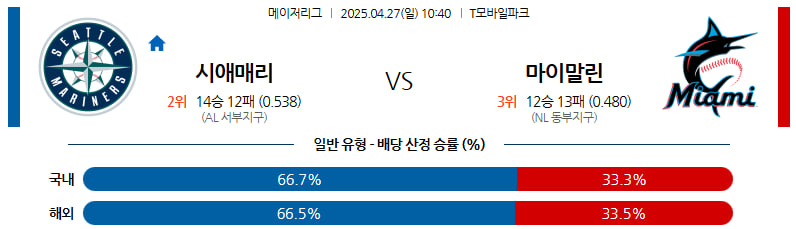 전날 경기는 로건 길버트의 급작스런 부상 강판, 그리고 딜란 무어의 어이 없는 실책으로 마이애미가 경기를 가져갈수 있었다. 즉, 길버트만 멀쩡했으면 시애틀이 승리했을 경기. 즉, 카스티요는 마이애미가 공략하기 쉽지 않고 길리스피는 콴트릴보다 좋은 투구를 기대할수 없다. 그리고 시애틀은 불펜 휴식을 확보했다. 선발에서 앞선 시애틀 매리너스가 승리를 가져갈 것이다.