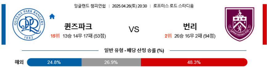 전술 완성도, 조직력, 중원 지배력 등 모든 지표에서 번리가 QPR을 압도할 수 있다. QPR은 수비 라인의 붕괴와 공격 전개 단조로움, 후반 집중력 저하가 심각하며, 주전 결장으로 인한 전력 손실도 크다. 반면 번리는 패턴 플레이와 전방 압박, 측면 전개까지 균형 잡힌 전술 운용이 가능하다. 다만 QPR의 저조한 공격력과 번리의 실리적 운영을 감안하면 다득점보다는 2골 내외의 저득점 경기가 될 가능성도 있다.