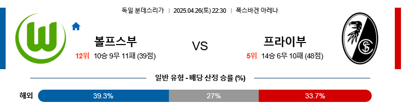 볼프스부르크는 부진한 흐름 속에서 다수의 주전 이탈로 전반적인 팀 밸런스가 무너진 상태이며, 측면 수비와 수비 전환에서 약점을 노출하고 있다. 프라이부르크는 전방의 유기적인 움직임과 전환 속도에서 강점을 보이나, 원정 경기라는 점과 골키퍼 이탈이라는 리스크는 분명 존재한다. 두 팀 모두 공격에서의 질적 우위는 제한적이며, 최근 경기력과 전력 누수를 고려할 때 서로 승점을 나눌 가능성이 높다.