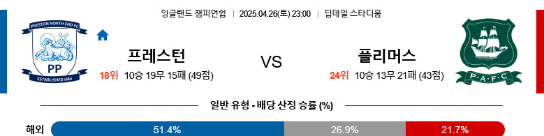 【EFL챔피언쉽】04/26(토) 프레스턴노스엔드vs플리머스아가일FC
