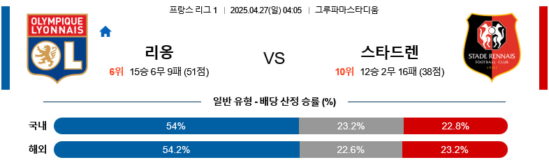 【리그앙 】04/27(일) 올림피크리옹vs스타드렌
