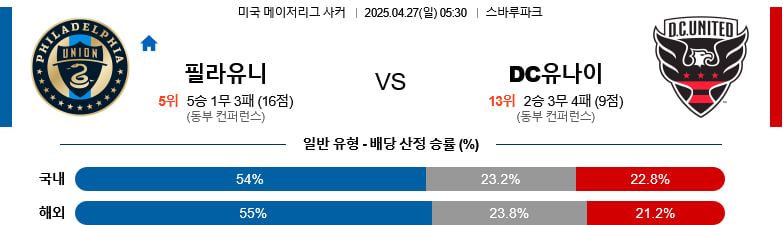 필라델피아는 간결하면서도 강한 압박 흐름을 전개할 수 있는 전술 완성도를 갖추고 있으며, DC유나이티드는 전방의 부상 이탈로 인해 공격 루트와 전환 속도 모두에서 한계가 뚜렷하다. 결국 이 경기에서는 라인 간격 유지와 세트피스 활용 측면에서 우위를 점하는 필라델피아가 승기를 잡을 가능성이 높다.
