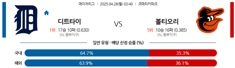 04월 28일 MLB 디트로이트 볼티모어 분석