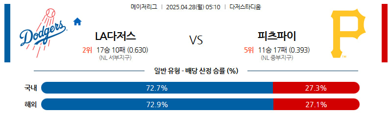 전날 경기는 다저스의 힘을 느낄수 있는 경기였다고 해도 과언이 아니다. 특히 중후반의 집중력은 피츠버그와 궤를 달리하는 부분. 개다가 다저스는 좌완 상대로 상당히 강하기도 하고 글래스나우는 홈 낮 경기 강점이 있다. 전력에서 앞선 LA 다저스가 무난하게 승리를 가져갈 것이다.