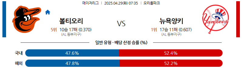 04월 29일 MLB 볼티모어 뉴욕양키스 분석