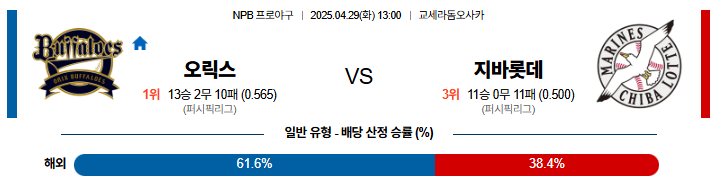 4월 29일 일본야구(NPB) 오릭스 VS 지바롯데 분석