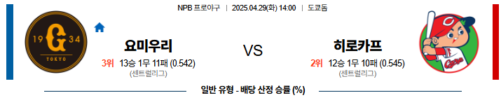 4월 한정으로 이노우에 하루토는 리그 최고 레벨 좌완이라고 해도 무방하다. 특히 낮 경기에서 절대적 강점을 가진 투수라는걸 잊으면 안될듯. 게다가 주말 시리즈에서 히로시마는 좌완 공략에 크게 애를 먹었다. 모리가 얼마나 막아주느냐지만 요미우리의 타선은 홈에선 강하다. 전력에서 앞선 요미우리 자이언츠가 승리를 가져갈 것이다.