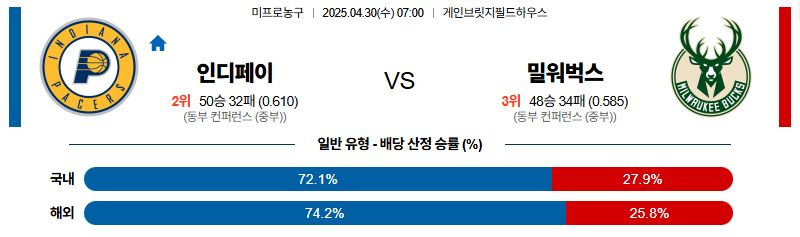 # 홈팀 : 인디애나 페이서스(정규시즌 50승32패, 동부커퍼런스 4위)