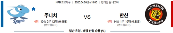 4월 30일 일본야구(NPB) 주니치 VS 한신 분석