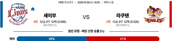 4월 30일 일본야구(NPB) 세이부 VS 라쿠텐 분석