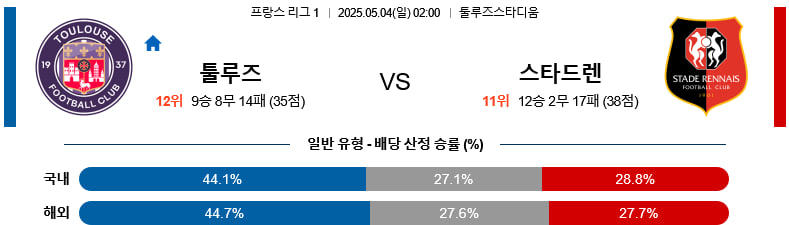 05/04(일) 툴루즈vs스타드렌 리그앙 분석