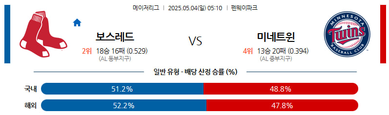 전날 경기에서 미네소타는 결국 피곤함을 이겨내지 못하면서 완패를 당하고 말았다. 하루가 지난 이번 경기는 조금 달라질수 있을듯. 양 팀의 선발 투수를 고려한다면 이번 경기는 꽤나 막상막하의 경기라고 할수 있을듯. 그러나 최근 미네소타의 불펜은 소모도가 높고 원정이라는 변수가 있다. 홈의 잇점을 가진 보스턴 레드삭스가 신승을 가져갈 것이다.
