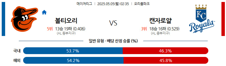 05월 05일 MLB 볼티모어 캔자스시티 분석