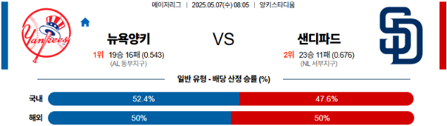 05월 07일 MLB 양키스 샌디에이고 분석