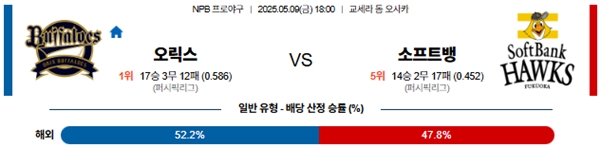 5월 9일 일본야구(NPB) 오릭스 VS 소프트뱅크 분석