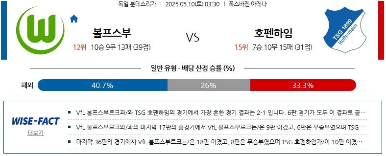05월 10일 분데스리가 VfL 볼프스부르크 TSG 1899 호펜하임 분석