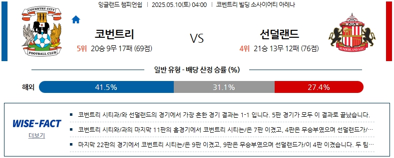 05월 10일 잉글랜드 챔피언쉽 코번트리 시티 선덜랜드 AFC 분석