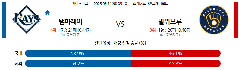 05월 11일 MLB 탬파베이 밀워키 분석