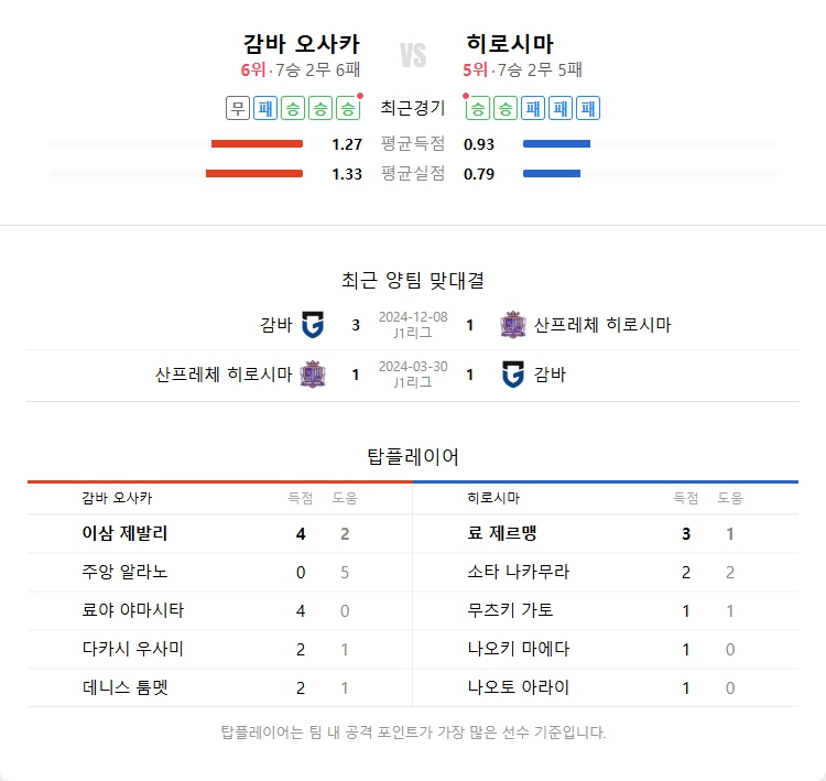 감바 오사카의 최근 홈 경기에서 다득점 경향이 강하고, 산프레체 히로시마도 아비스파 후쿠오카를 상대로 2-1로 승리한 점을 고려하면, 오버 2.5에 베팅하는 것이 긍정적으로 보인다.