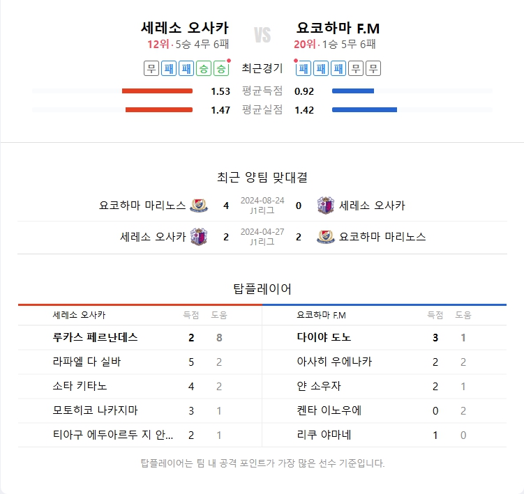 세레소 오사카는 최근 공격력이 뛰어나고, 요코하마 F 마리노스는 수비에서 다소 불안한 모습을 보여주고 있다.
