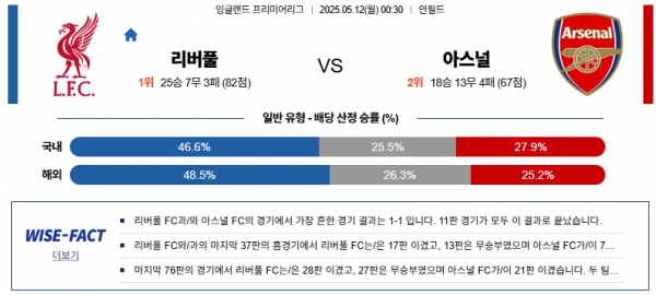 【잉글랜드 프리미어리그】05월12일 리버풀 vs 아스날 분석