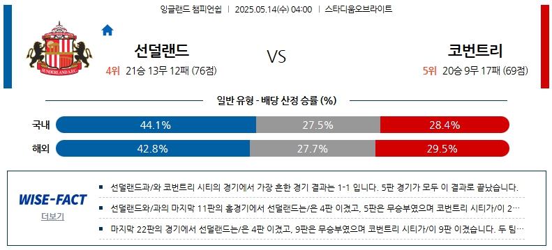 05월 14일 잉글랜드 챔피언쉽 선덜랜드 AFC 코번트리 시티 해외축구분석