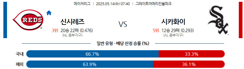 현재 양 팀 모두 타격의 기복이 심한 편이다. 선발 투수만 놓고 본다면 막상막하일수 있는 상황. 그렇지만 애보트는 홈에서 절대적 강점을 가지고 있는 투수다. 무엇보다 신시내티 타선은 일단 홈에서의 타격 자체는 나쁘지 않은 반면 화이트삭스의 타선은 원정에서 기대가 되지 않는다. 홈의 잇점을 가진 신시내티 레즈가 승리를 가져갈 것이다.