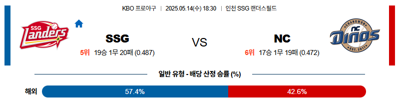 전날 NC는 다 이긴 경기를 불펜의 난조로 패배했다. 한번 불펜이 흔들리면 시리즈 내내 흔들리는 문제는 이번 경기에서도 약점이 될수 있는 포인트. 게다가 송영진은 홈에서 상당히 강한 투수인 반면 아직 목지훈은 기복이 심하다는 문제가 있다. 그리고 SSG는 최정을 바탕으로 타격이 확실히 살아났다. 선발에서 앞선 SSG가 무난하게 승리를 가져갈 것이다.