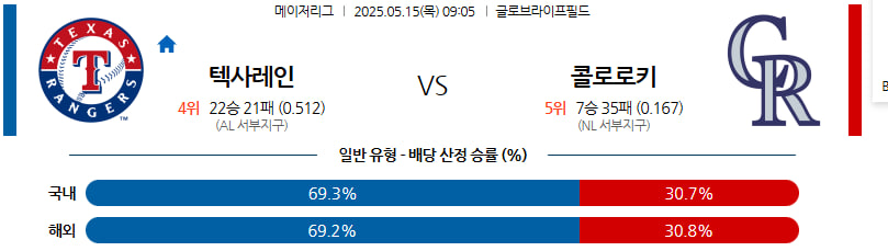 현재의 콜로라도는 산 위든 아래든 좌완 공략이 안되는 팀이다. 코빈을 공략한다는건 난이도가 높아도 너무 높은 문제. 게다가 센자텔라는 원정에서 피안타율이 극도로 높은 투수고 선발로서의 역할도 잘 해내지 못하고 있다. 텍사스의 타격이 아쉽긴 해도 센자텔라를 공략하지 못할 정도는 아니고 불펜도 우위를 점유중이다. 전력에서 앞선 텍사스 레인저스가 승리를 가져갈 것이다.