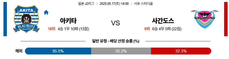 【일본J2리그】05월17일 아키타 vs 사간도스 분석