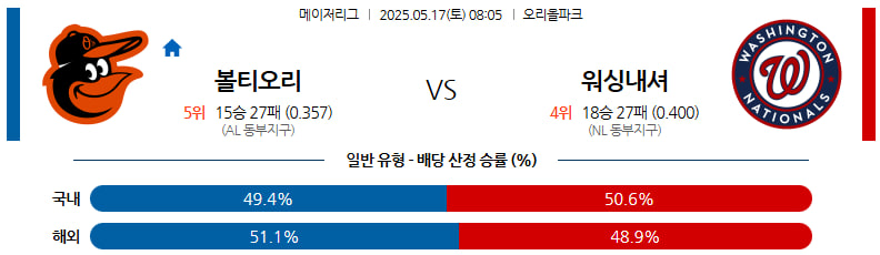 05월 17일 MLB 볼티모어 워싱턴 MLB분석