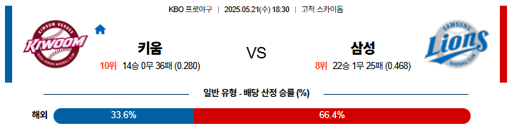 하영민이 선발로 나선다. 시즌 평균 5이닝 남짓은 채우지만, 실점 억제력은 뚜렷하게 흔들리고 있다. 최근 3경기에서 피안타와 볼넷이 급격히 늘며, 5월 들어 ERA가 7점대까지 치솟았다. 고척 홈에서는 비교적 강했지만, 최근 볼넷 난조로 위기관리 능력이 크게 약화됐다. 좌타자 상대 피안타율이 높고, 주자 있을 때도 실점률이 치솟는 등 불안 요소가 많다. 결정구 구사에서 일관성을 잃었고, 경기 후반 실점 집중 현상이 도드라진다. 삼성 타선의 좌우 조화와 집중력을 감안하면 5이닝 내외 다실점이 불가피하다.