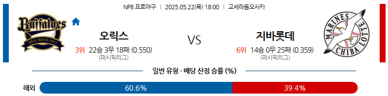 최근의 치바 롯데는 좌완 상대 경기력이 빈말로도 좋다고 할수 없는 레벨이다. 미야기와 타지마의 스타일을 고려한다면 이번 경기 역시 고전 가능성이 높은 편. 강속구를 앞세운 요코야마라면 어떻게든 타순이 한 바퀴 돌때까지는 버텨주겠지만 그 뒤가 문제고 치바 롯데는 현재 불펜이 약하다. 전력에서 앞선 오릭스 버팔로스가 승리를 가져갈 것이다.