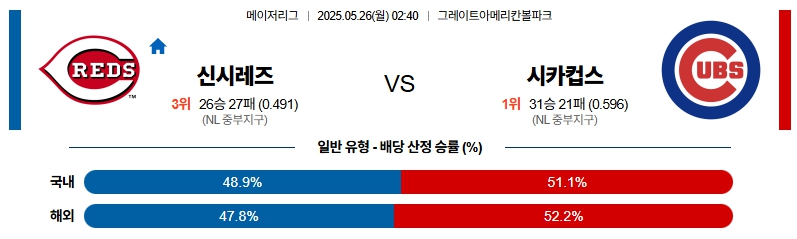 5월 26일 MLB 신시내티 VS 시카고컵스 분석