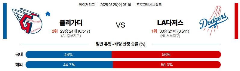 5월 28일 MLB 클리블랜드 VS LA다저스 분석