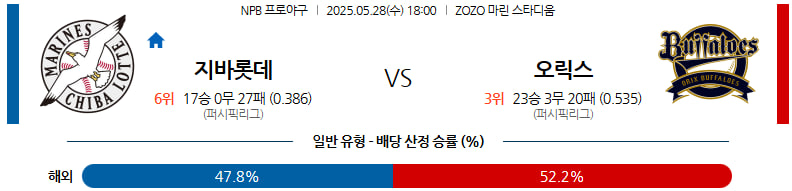 전날 경기에서 치바 롯데는 자신들의 특징을 유감없이 드러내보였다. 즉, 에스피노자 상대 타격은 기대가 어렵다는 이야기. 결국 타네이치가 얼마나 버텨주느냐인데 지금의 타네이치는 밸런스가 심하게 깨져 있는 상태고 전날 오릭스는 막판에 오노를 공략하면서 어느 정도 답을 찾은 상태다. 상성에서 앞선 오릭스 버팔로스가 신승을 가져갈 것이다.