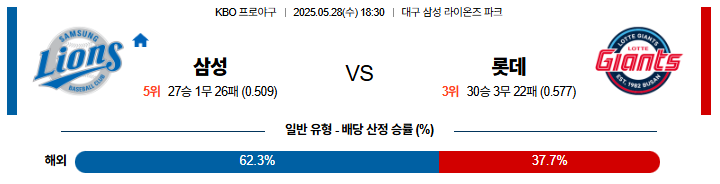 1차전은 감보아의 약점을 파고든 삼성의 승리였다. 이번 경기 역시 그 흐름을 이어갈수 있을듯. 후반에 타선이 살아나기 시작한건 나균안 상대로 강점이 될수 있는 부분. 물론 홈 경기의 레예스는 기대하기 힘든게 엄연한 현실이긴 하지만 홈 경기의 화력전이라면 삼성이 밀릴 이유가 없다. 화력에서 앞선 삼성이 신승을 가져갈 것이다.