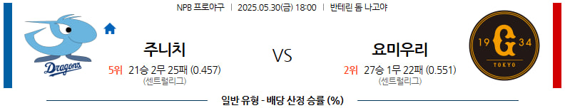 주니치 : 오노 유다이(1승 2패 3.47)가 시즌 2승 도전에 나선다. 20일 DeNA 원정에서 1.1이닝 4실점의 부진으로 패배를 당한 오노는 원정에 약한 문제를 전혀 극복하지 못하고 있는 중. 일단 홈이라는 강점은 있는데 요미우리 상대로 4월 3일 홈에서 5이닝 4실점 패배를 당했다는 점이 불안 요소다.