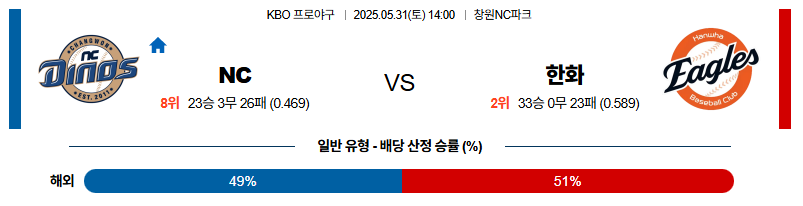 전날 류현진이 선제 실점을 했을때만 해도 분위기는 NC쪽이었다. 그러나 빠르게 한화는 그 분위기를 뒤집는데 성공했고 결과는 대승. 한 번 탄 분위기는 쉽게 식지 않을 것이다. 김녹원과 엄상백은 일단 선발로서 막상막하에 가까운 모습을 보여주겠지만 후반의 경기력은 한화가 더 낫고 이 점이 결국 승부를 가를 것이다. 후반에 강한 한화가 승리를 가져갈 것이다.