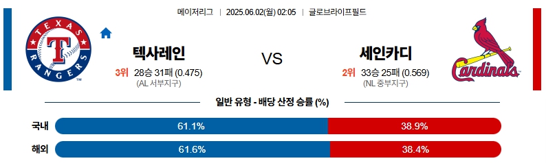 6월 2일 MLB 텍사스 VS 세인트루이스 분석