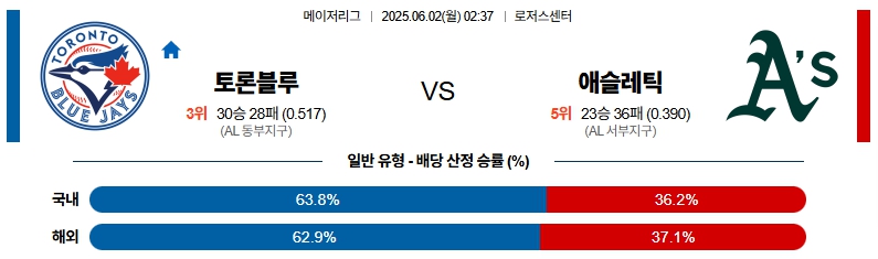 6월 2일 MLB 토론토 VS 에슬레틱 분석