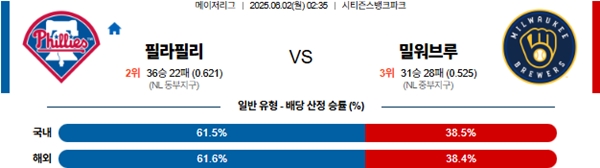 6월 2일 MLB 필라델피아 VS 밀워키 분석