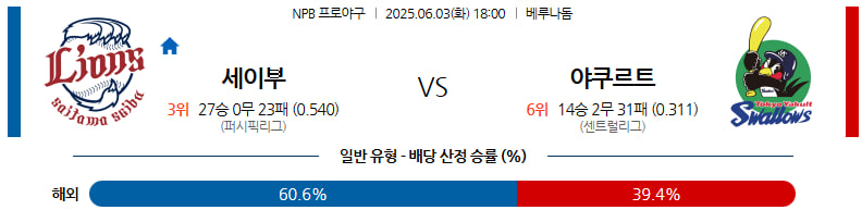 세이부는 득점력이 그다지 좋지 않은 팀이다. 램버트 상대로 다득점을 기대하긴 힘들듯. 그러나 최근의 야쿠르트는 타격 페이스가 엉망이라는 말이 어울리고 좌완 상대로는 아예 힘을 쓰지 못하고 있다. 즉, 스미다 공략은 포기해야 한다는 이야기다. 선발에서 앞선 세이부 라이온즈가 승리를 가져갈 것이다.