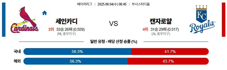 6월 4일 MLB 세인트루이스 VS 캔자스시티 분석