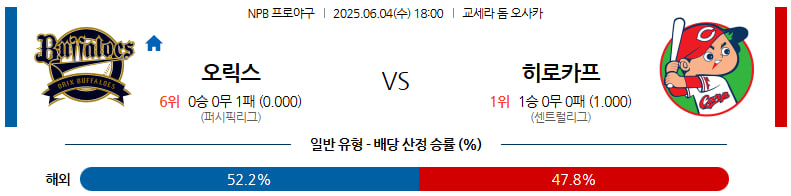 오릭스 : 타지마 다이키(2승 2패 3.90)가 시즌 3승 도전에 나선다. 22일 치바 롯데와 홈 경기에서 5.2이닝 6실점의 부진으로 패배를 당한 타지마는 최근 2경기 연속 5실점 이상의 부진이 홈에서 이어지고 있는 중이다. 작년 교류전 투구 역시 엉망이었음을 고려한다면 반등을 하기가 쉽지 않을 것이다.