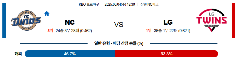 오래간만에 메가 트윈스포가 터졌다. 이 흐름을 이어갈수 있느냐가 관건일듯. LG에게 강한 앨런임을 고려한다면 이번 경기는 투수전 가능성이 있는 편. 그렇지만 최근 NC는 불펜이 흔들리는 문제가 있고 이 점이 후반에서 크게 요동칠 것이다. 투수력에서 앞선 LG가 신승을 가져갈 것이다.