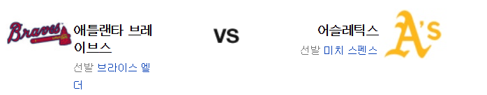 또다시 애슬레틱스의 타선이 폭발했다. 홈에서 초반 기선 제압에 성공한건 강점이 될수 있는 부분. 애틀랜타의 타선 스타일을 고려한다면 스펜스는 나름 제 몫을 해낼수 있을듯. 반면 지금의 엘더는 밸런스가 많이 깨져 있는 편이고 양 팀 불펜을 고려한다면 선발의 차이는 중요하다. 상성에서 앞선 애슬레틱스가 신승을 가져갈 것이다.