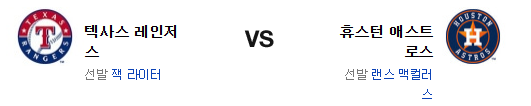 텍사스 : 잭 라이터(4승 6패 4.32)가 시즌 5승에 도전한다. 7일 샌디에고 원정에서 3.2이닝 2실점의 부진으로 패배를 당한 라이터는 역시 원정에서 기대가 되지 않는 투수임을 다시금 증명해 보였다. 휴스턴 상대로 5월 19일 홈에서 7이닝 3실점 투구를 해내긴 했지만 이번은 홈이 아니다.
