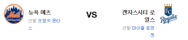 뉴욕 메츠는 프랭키 몬타스(1승 1패 6.14)가 시즌 2승에 도전한다. 6일 양키스와 홈 경기에서 5.2이닝 4실점의 투구로 쑥쓰러운 승리를 거둔 몬타스는 예년과 다르게 홈에서 그다지 힘을 쓰지 못하고 있다는 점이 불안 요소다. 원래 원정 투구가 좋지 않았던 투수임을 고려한다면 이번 경기는 은근히 위험할수 있다. 전날 경기에서 와카의 투구에 막혀 있다가 막판 2이닝동안 캔자스시티의 불펜을 공략하면서 8점을 올린 메츠의 타선은 해줘야 할 타자들이 결정적으로 해준게 너무나 컸다. 역전 3타점 2루타를 터트린 마크 비엔토스는 이번 경기를 통해 반등의 찬스를 잡은듯. 그러나 센가 강판 이후 5이닝동안 3실점을 허용한 불펜은 반성 좀 해야 한다.